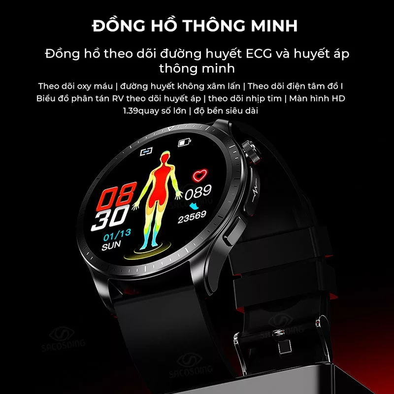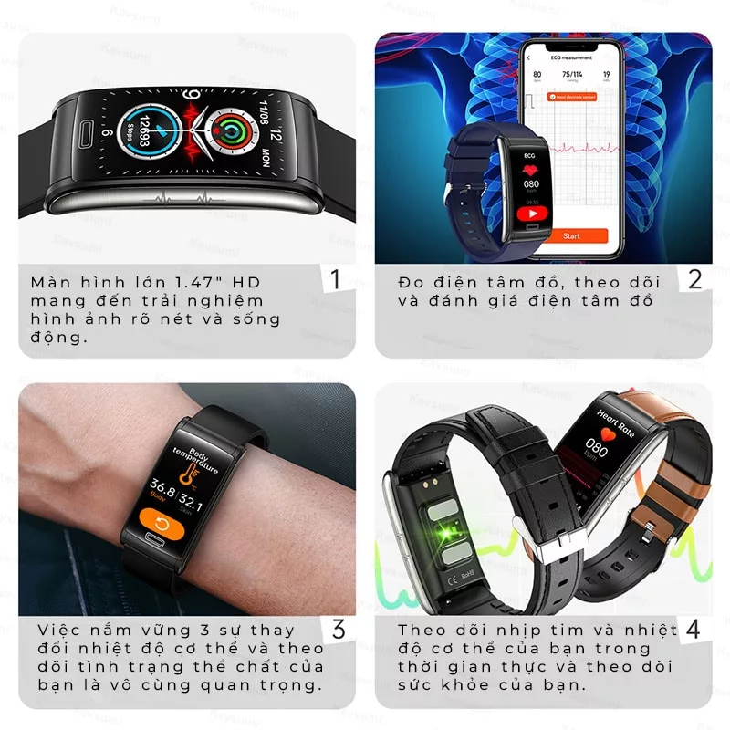 - Theo dõi huyết áp, đo lượng đường trong máu, đo nhiệt độ, đo ECG, thông báo tin nhắn thời tiết, đồng hồ báo thức,