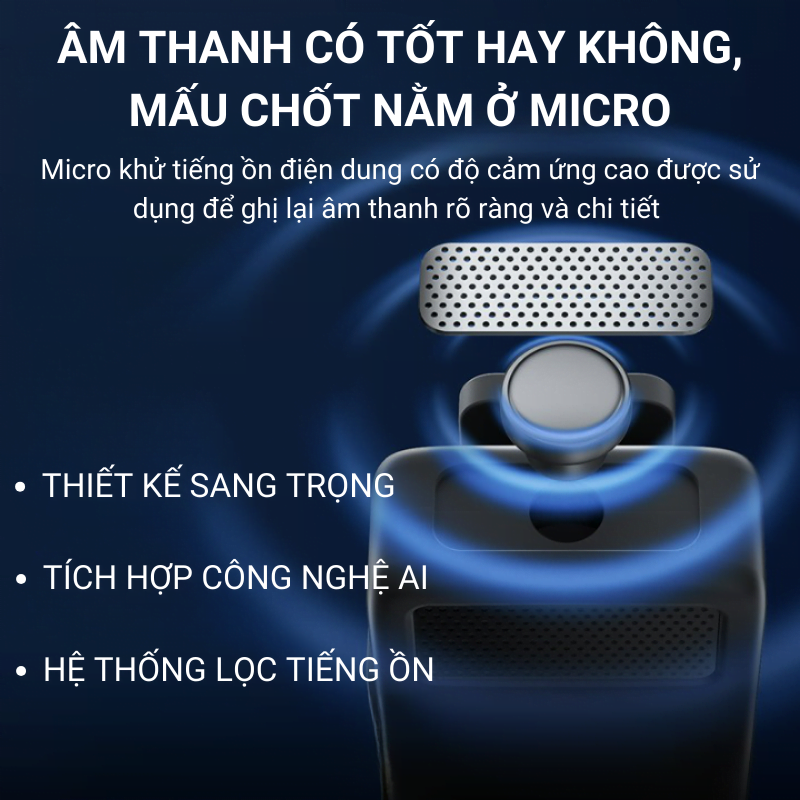 - Sản phẩm có chức năng lọc tạp âm khử tiếng ồn thông minh nhờ chip giảm tiếng ồn chuyên nghiệp và tấm chắn gió cung cấp âm thanh chất lượng và chi tiết đến 98%.